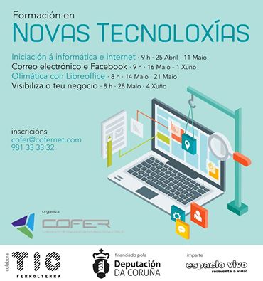 La Cofederación de Empresarios de Ferrolterra y la Asociación TIC Ferrolterra organizan una serie de cursos de nuevas tecnologías orientados a empresarios y emprendedores integrados en alguna de las Asociaciones pertenecientes a COFER.Los cursos que se van a llevar a cabo son Iniciación a la informática Internet, Iniciación al Correo Electrónico y Facebook, Iniciación al Libre Office y Visibiliza tu negocio e Internet. Todos ellos tendrán lugar en el Centro Espacio Vivo en la C/ Sol de Ferrol.