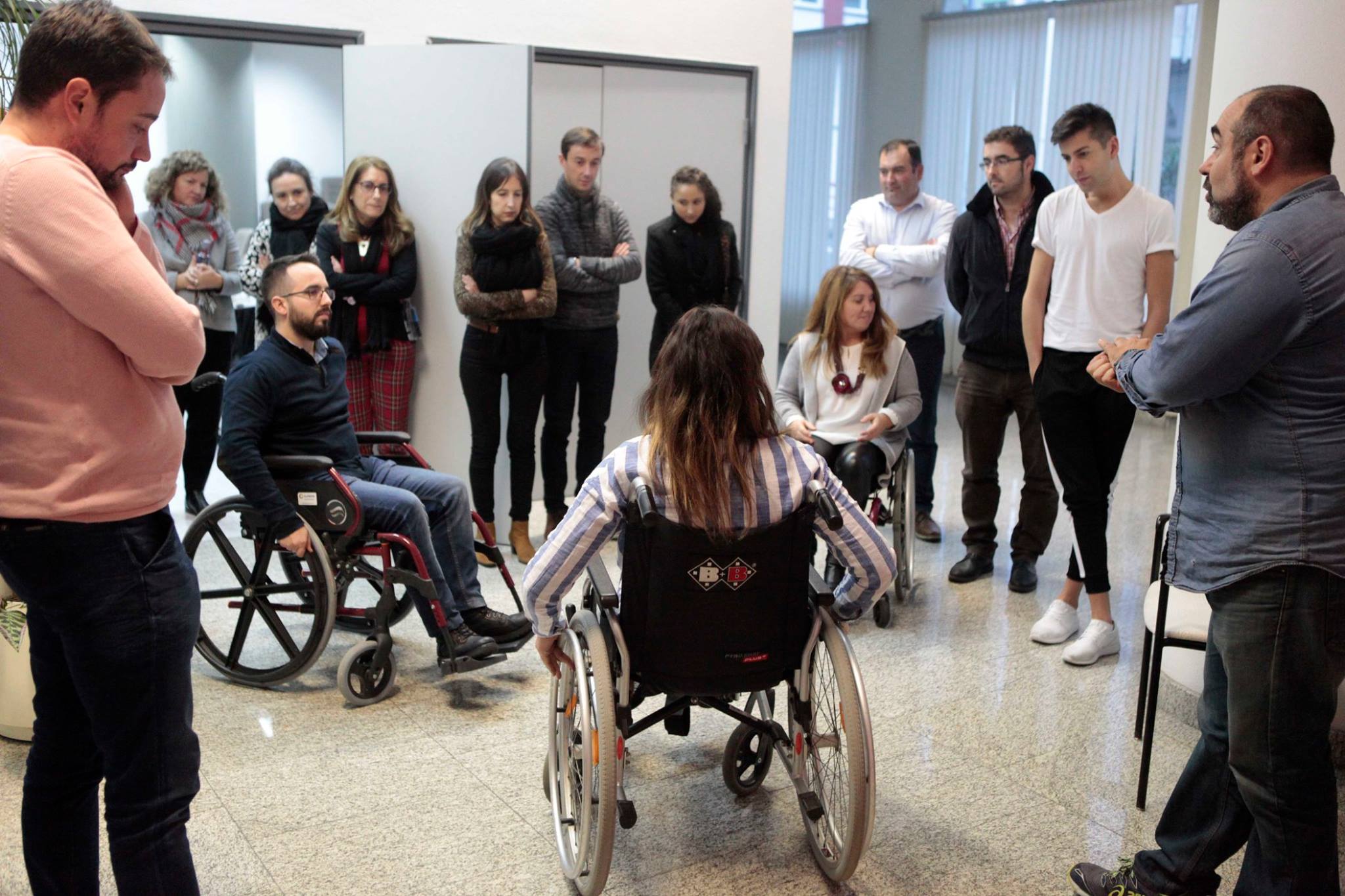 En la parte práctica del taller, al tener que usar una silla de ruedas vari@s asistentes vivieron con especial dificultad el simple hecho de abrir una puerta mientras que en otra dinámica de grupo l@s participantes comprendieron la importancia de saber cómo actuar a la hora de ayudar a una persona con discapacidad visual.