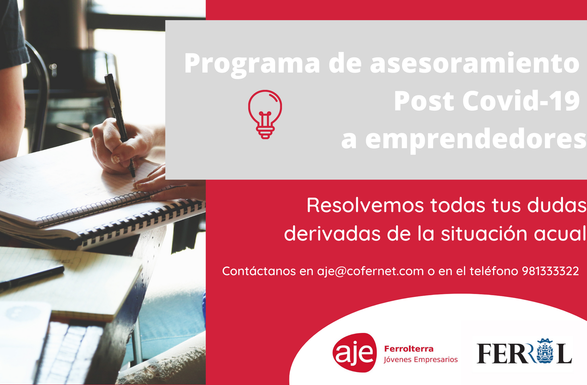 En AJE Ferrolterra tenemos activo desde octubre el programa de asesoramiento post-covid patrocinado por el Concello de Ferrol a través del cual los emprendedores pueden resolver las dudas que les surjan en sus negocios como consecuencia de los cambios que se están produciendo debido a la crisis sanitaria de la COVID-19 resueltas por expertos en temas financieros, consultas legales, ERTE, subvenciones o restricciones.