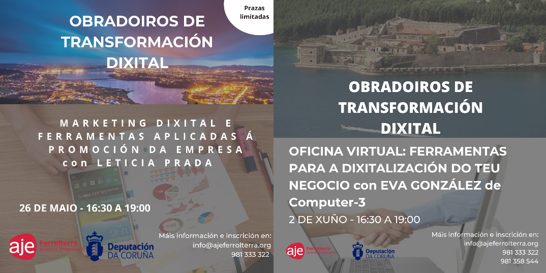O próximo mércores 26 de maio inician os obradoiros de Transformación Dixital. A primeira sesión será o mércores 26 de maio de 16:30h a 19:00h “Marketing dixital e ferramentas aplicadas á promoción da empresa” por Leticia Prada e o mércores 2 de xuño de 16:30h a 19:00h “Oficina Virtual: ferramentas para a dixitalización do teu negocio” por Eva González de Computer-3.