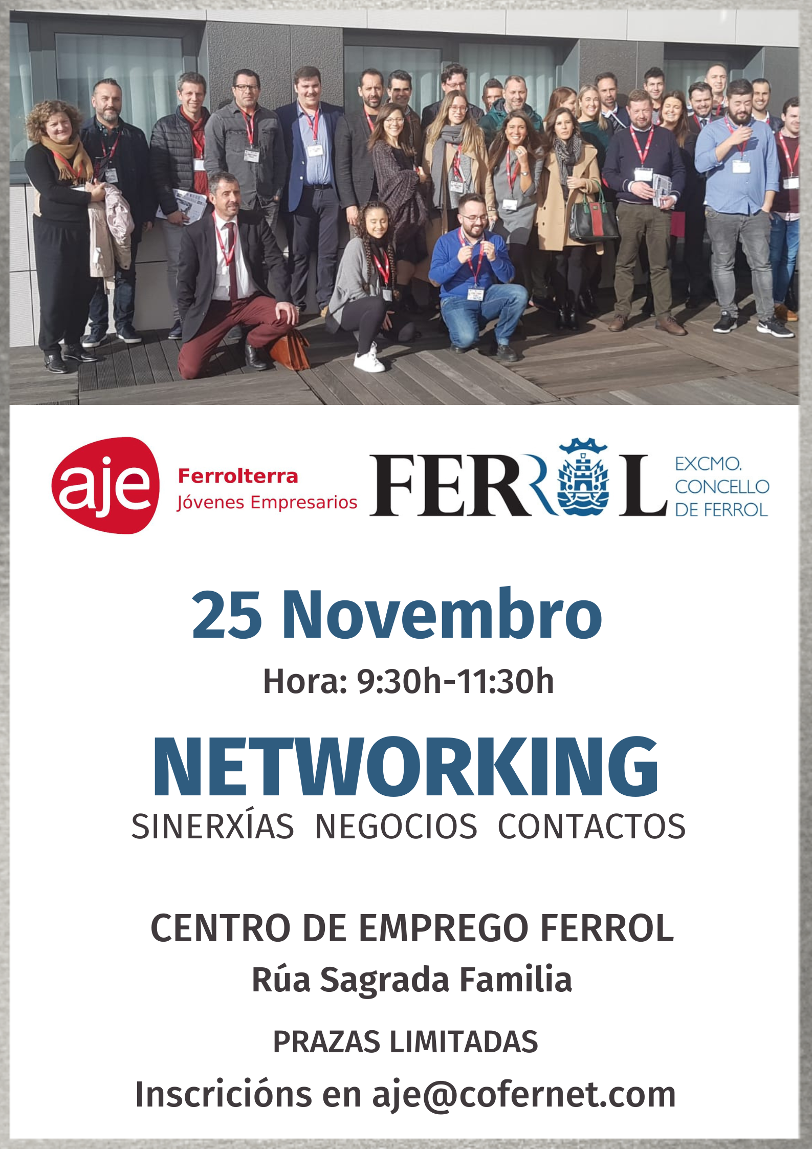 AJE Ferrolterra en colaboración con el Concello de Ferrol lleva a cabo el 25 de noviembre una jornada de Networking en el Centro de Empleo del Concello con el objetivo de crear sinergías entre los participantes y generar negocio entre si.