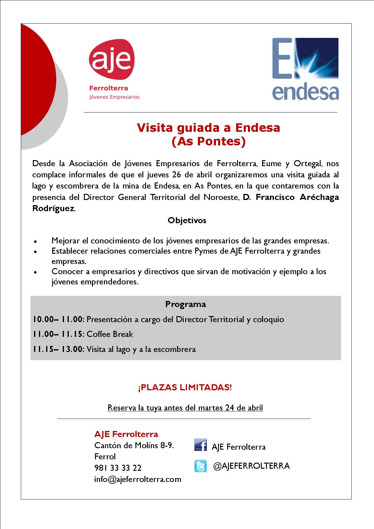 Desde la Asociación de Jóvenes Empresarios de Ferrolterra, Eume y Ortegal, nos complace informales de que el jueves 26 de abril organizaremos una visita guiada al lago y escombrera de la mina de Endesa, en As Pontes, en la que contaremos con la presencia del Director General Territorial del Noroeste, D. Francisco Aréchaga Rodríguez.